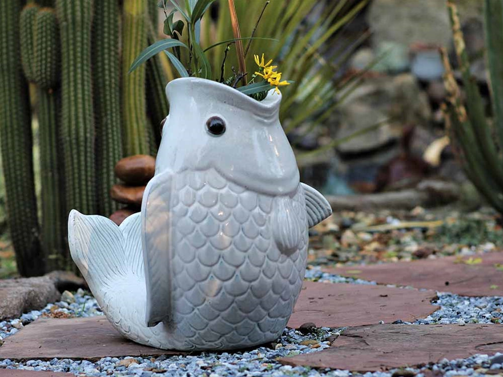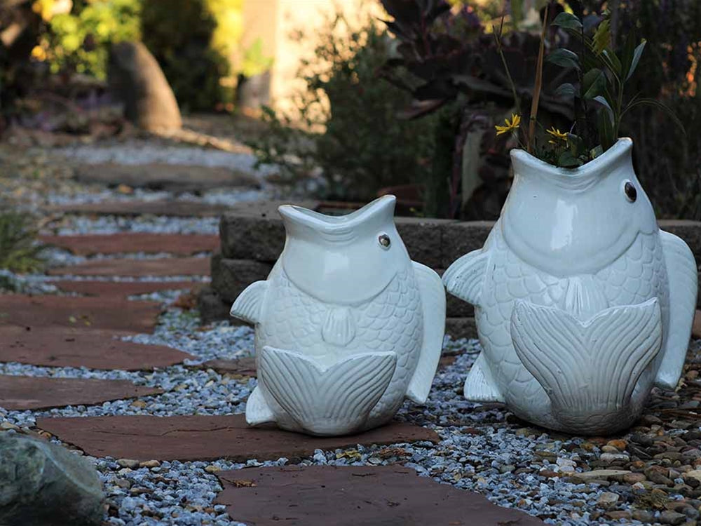 Majestic and glistening, this Leaping Carp figurine draws harmony and good fortune wherever it is nestled. Revered as a symbol of success and prosperity, use it to display small plants or display it by itself as an accent piece. Pair with other aquatic elements and place near pools, ponds, or fountains.