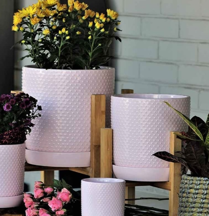 DOTTED CYLINDER PLANTER WITH ATTACHED SAUCER